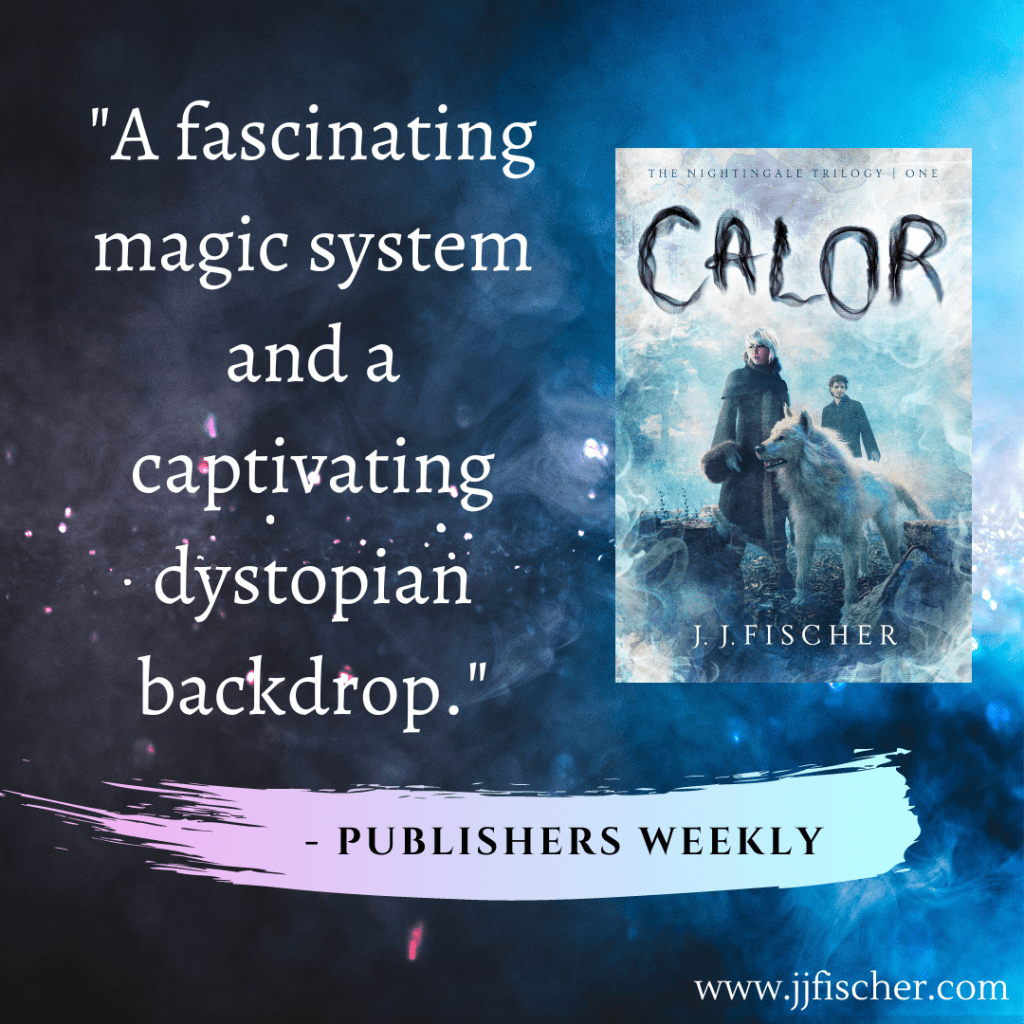 Not hooked yet? Did I mention there’s magic? And a wolf? What about good guys and bad guys (guess which one has the quarterstaff)? Snark? Adventure and danger and fights and rescues—all with a thread of budding romance? If this sounds up your alley, you’ll love Calor, book one of J. J. Fischer’s Nightingale Trilogy.